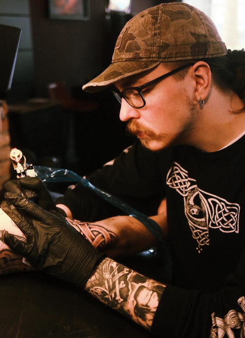 “Binnen alle stijlen die ik beheers ligt mijn persoonlijke interesse en specialisatie het meest bij Noorse/Germaanse en Keltisch tattoo werk. De uitwerking hiervan kan heel verschillend zijn en ook zeer persoonlijk gemaakt worden in symboliek en uitstraling.